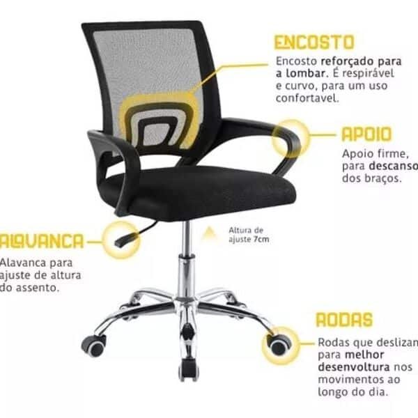 o assento e encosto são revestidos em tela mesh, um material que permite a circulação do ar e ajuda a manter a temperatura agradável durante longas horas sentado. Além disso, a cadeira conta com ajuste de altura através de uma alavanca, que permite uma posição adequada em relação à mesa. para garantir a postura correta durante o uso, a cadeira de escritório mesh giratória e ergonômica apresenta encosto com ajuste de inclinação e apoio para a região lombar. Também possui braços reguláveis, que se adaptam a diferentes necessidades.