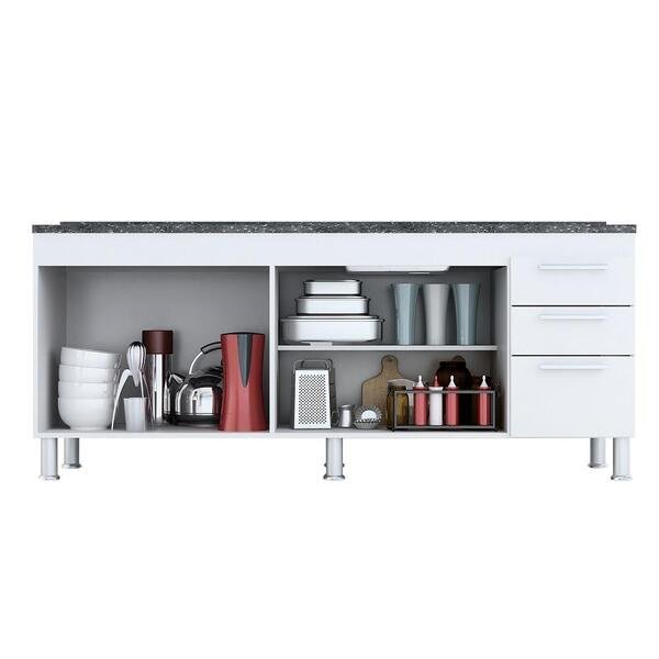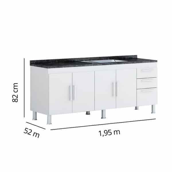 Gabinete para pia | este gabinete é produzido especialmente para pias de 2m, possui 3 gavetas com corrediças metálicas para melhor armazenar os itens de cozinha e conta com uma prateleira profunda completa no seu interior. Possui puxadores modernos e 6 pés para evitar empenamento da base, o gabinete é totalmente fabricado em mdp de 12mm, aumentando a durabilidade, resistência e qualidade do produto. O gabinete não acompanha o tampo da imagem. Além desses detalhes possui uma fácil montagem. Altura total 81,5cm x largura 1,94m x profundidade 0,52m x peso 39kg \não nos responsabilizamos pela montagem ou instalação do produto. Sugerimos a contratação de um serviço terceirizado de montagem ou de algum profissional experiente de sua preferencia. Não indicamos serviço de montagem. Imagem meramente ilustrativa\ descrição não utilizamos whatsapp para contato com os nossos clientes. Não autorizamos retirada de produto nas nossas lojas. Não vendemos para cnpj. Não alteramos endereço após a finalização do pedido. Atenção para seus dados de entrega: não realizamos entregas para: – cadastro sem número de telefone; – cadastro sem número de documento válido; – endereço sem número (casa, apto, bloco); – caixa postal; – nome incompleto. Dados necessários para a entrega: – nome completo – telefone (informe o código de área sem o 0 + telefone) – endereço de entrega (casa, apto, bloco) – endereço de e-mail. Política de troca e devolução nos termos da política de troca e devolução, você poderá realizar a troca do seu produto por meio do nosso sac (serviço de atendimento ao consumidor), caso haja a constatação de avarias, embalagem violada, itens faltantes ou produto em desacordo com o pedido. Essa solicitação deverá ser feita em até 07 (sete) dias corridos após a data de recebimento do produto. Orientamos que fique atento aos itens abaixo a fim de evitar problemas com sua compra: – descrição, características e especificações do produto; – tonalidade e dimensões do produto (imagens meramente ilustrativa