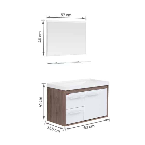 Perfeito para banheiros pequenos, o Kit Gabinete para Banheiro com Cuba e Espelho, da Cerocha tem 41 cm de altura, 63 cm de largura e 31,5 cm de profundidade. Esta metragem é o suficiente para guardar muita coisa e ainda auxiliar no visual da decoração do seu ambiente. Feito em , material de boa durabilidade. Para que sua solução seja ainda mais completa, ele acompanha espelho e cuba, toda a solução em um só produto!