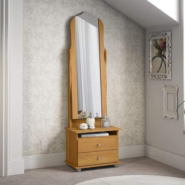 Este toucador é equipado com um ótimo espaço de armazenamento e um espelho deslumbrante, ele é ideal para organizar seus cosméticos e acessórios enquanto você se prepara para o dia. 02 gavetascorrediças metálicasespelho articulado de corpo inteiro dimensão do produtoaltura: 164,5 cmlargura: 50,5 cmcomprimento: 33,5 cm informações do produto: cor:cinamomo; material: mdp; sapatas protetora: sim ; gavetas: sim (2) gavetas com corrediças metálicas; pés: sim (4); nicho: sim (1); espelho: sim (1) itens inclusos: 1 toucador manual de montagem kit completo para montagem e manual de instruções garantia: 3 meses contra defeito de fabricação informações adicionais: – fotos meramente ilustrativas do produto no ambiente. – os objetos que ambientam as fotos não acompanham o produto; – verificar descrição e tamanho do produto antes da compra. – avaliar a mercadoria no ato do recebimento e recuse em caso de divergência ou danos. – mantenha as informações de contato e endereço de entrega atualizados para entrarmos em contato caso necessário. – limpar com flanela ou pano macio seco, não utilizar produtos abrasivos, desengordurantes, álcool ou solvente. Não expor o produto diretamente à luz solar e à umidade. * sugerimos a contratação de um montador profissional para a montagem do produto. Não nos responsabilizamos por danos causados no ato da montagem. * não nos responsabilizamos pela montagem e desmontagem do produto no ato da entrega e devolução, assim como os custos gerados nestas situações. * a transportadora entregará o produto no andar térreo do endereço de entrega. * não nos responsabilizamos por subir escadas, corredores e elevadores ou transporte por guincho em apartamentos.